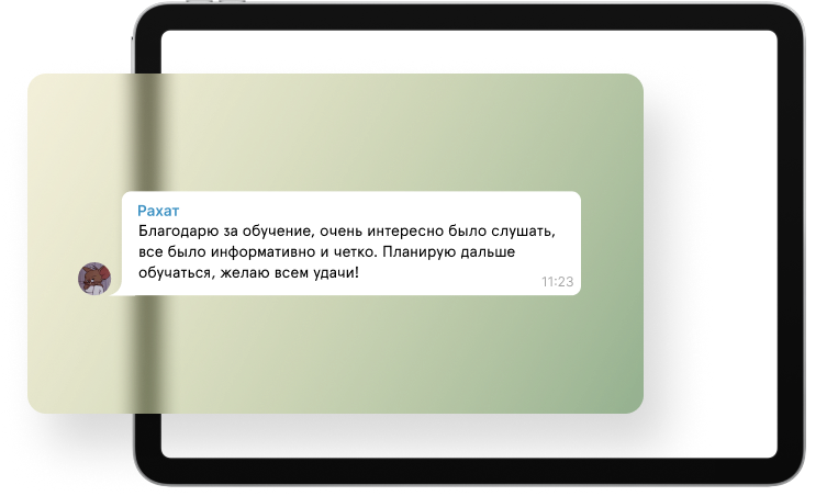 Благодарю за обучение, очень интересно было слушать, все было информативно и четко. Планирую дальше обучаться, желаю всем удачи!