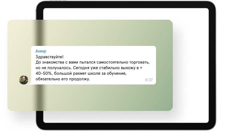 Здравствуйте! До знакомства с вами пытался самостоятельно торговать, но не получалось. Сегодня уже стабильно выхожу в + 40-50%, большой рахмет школе за обучение, обязательно его продолжу.