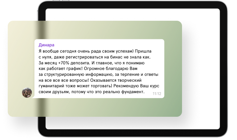 Я вообще сегодня очень рада своим успехам) Пришла с нуля, даже регистрироваться на бинас не знала как. За месяц +70% депозита. И главное, что я понимаю как работает график! Огромное благодарю Вам за структурированную информацию, за терпение и ответы на все все все вопросы! Оказывается творческий гуманитарий тоже может торговать) Рекомендую Ваш курс своим друзьям, потому что это реально фундамент.