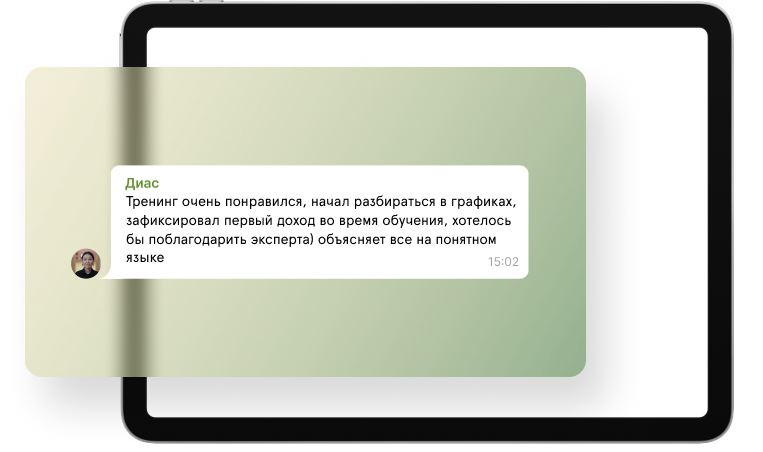 Тренинг очень понравился, начал разбираться в графиках, зафиксировал первый доход во время обучения, хотелось бы поблагодарить эксперта) объясняет все на понятном языке